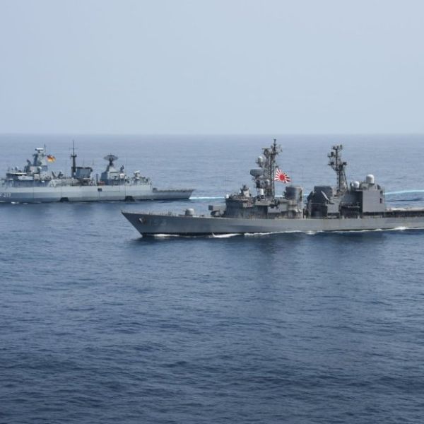 Naval drills between German frigate Bayern and destroyer JS Yugiri