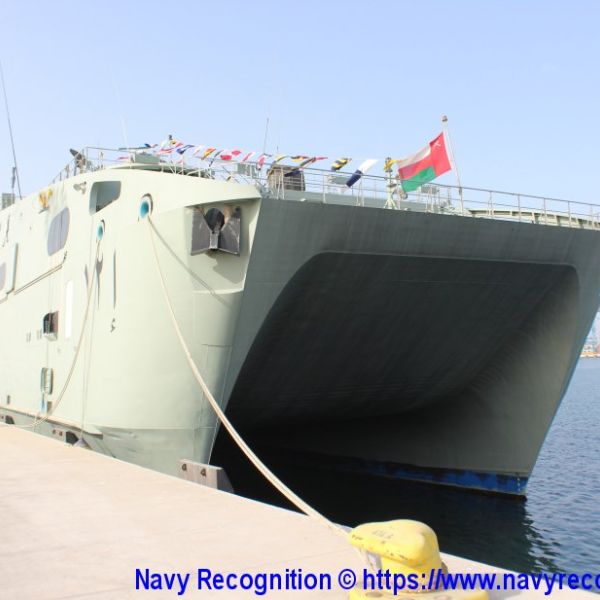 The Royal Navy of Oman showcases the Al Mubshir class High-Speed Support Vessel Al Naasir at Doha International Maritime Defence Exhibition & C...