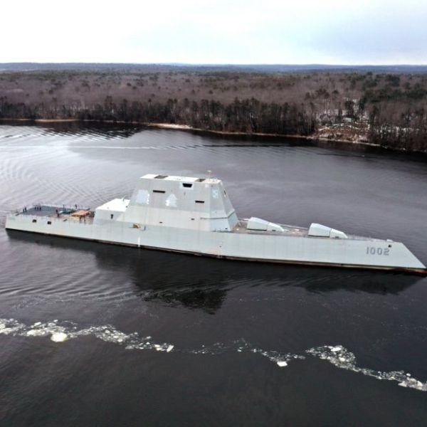 Zumwalt-class destroyer USS Lyndon B. Johnson leaves Bath Iron Works