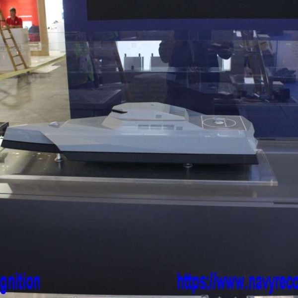 Among the technological displays at this year's DSEI event, the US company Leidos presented a model of the Sea Hunter USV.