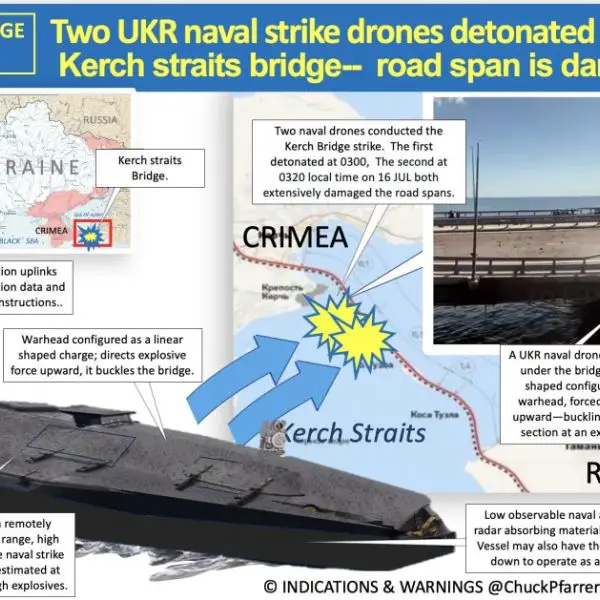 According to a tweet published by Chuck Pfarrer on July 19, 2023, the Kerch Straits Bridge was targeted in a second attack by Ukraine, this time ut...