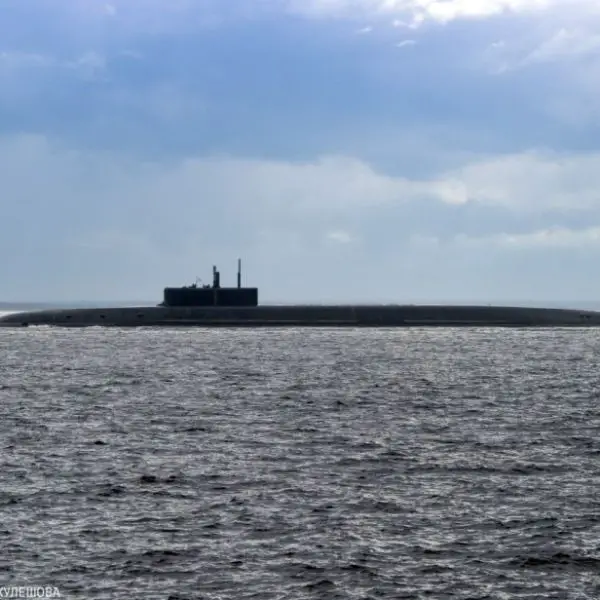 The inaugural photograph of the nuclear-propelled strategic missile submarine, "Emperor Alexander III," during its factory sea trials, has been rel...