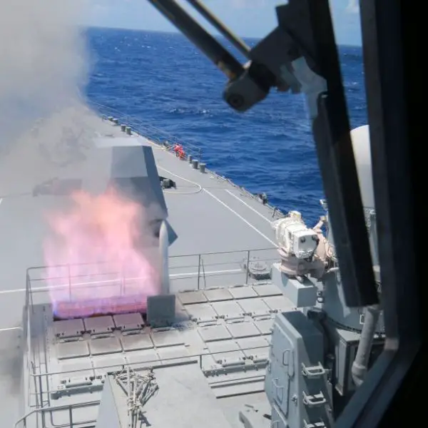 Japan Navy's Akizuki class destroyer JS Suzutsuki fires ESSM missile