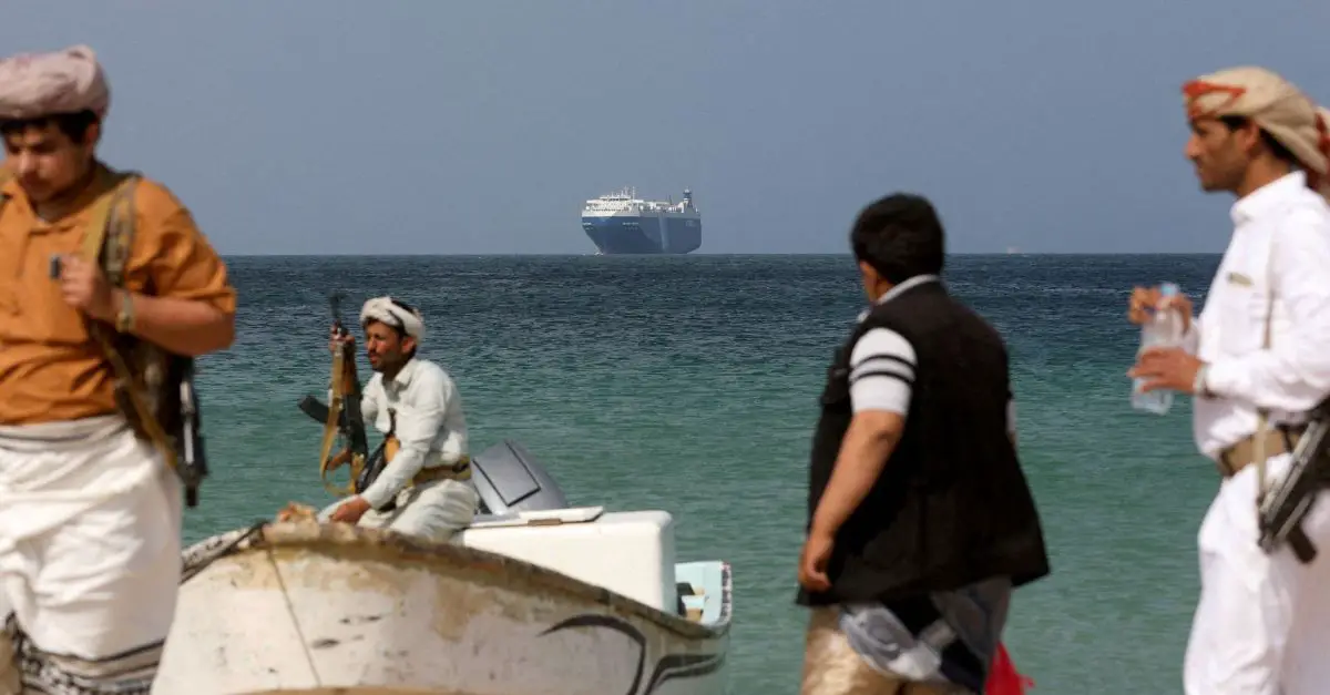 Houthis rebels near occidental ferry ship named Galaxy Leader. The ship was air assaulted by Houthis on October 19, 2023(Picture source: Reuters)