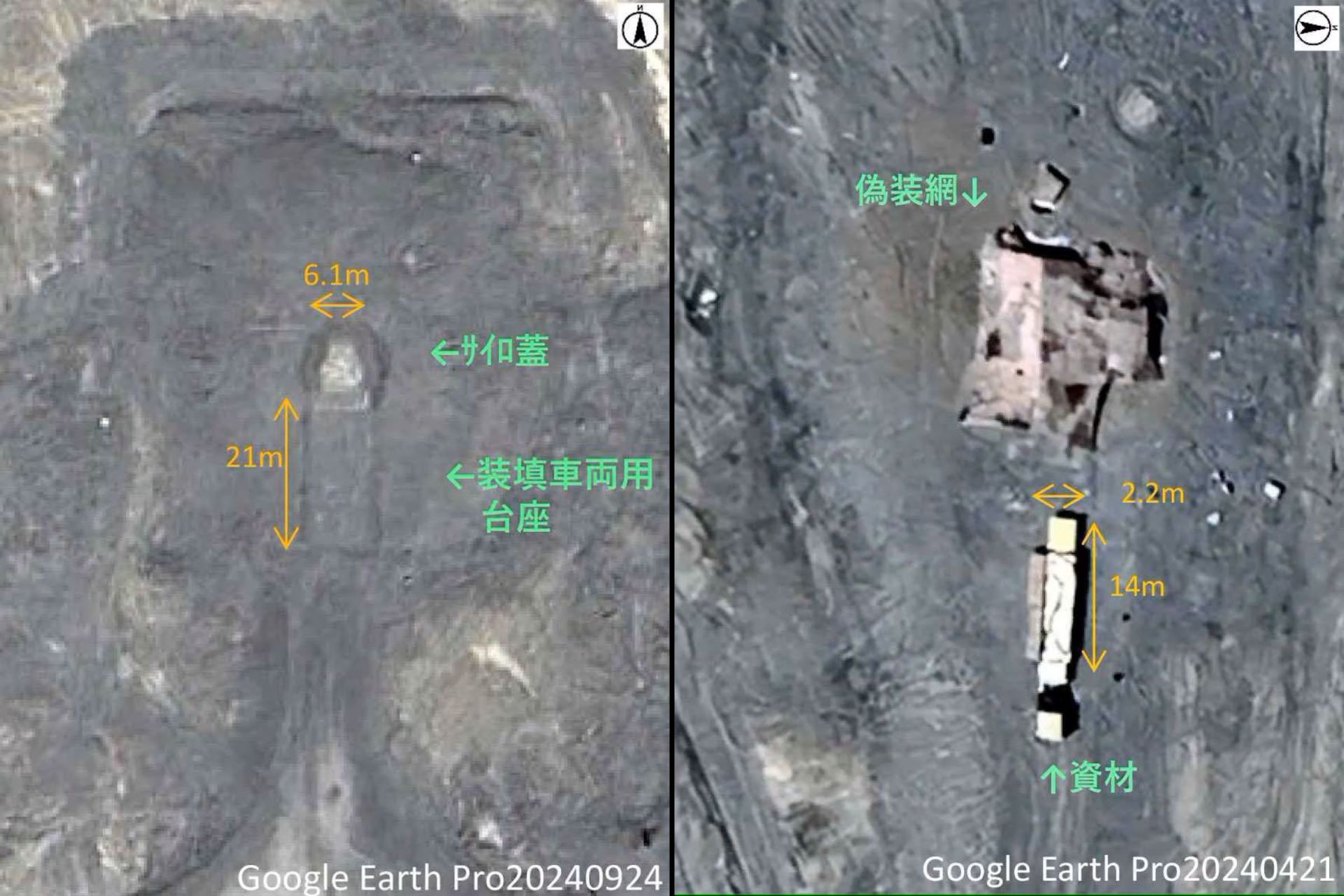 On the left, a missile silo in Yumen, Gansu Province, with its camouflage net removed and lid in place, On the right, a missile silo in Yumen, Gansu Province, covered with camouflage nets (Picture source: Japan Institute for National Fundamentals)