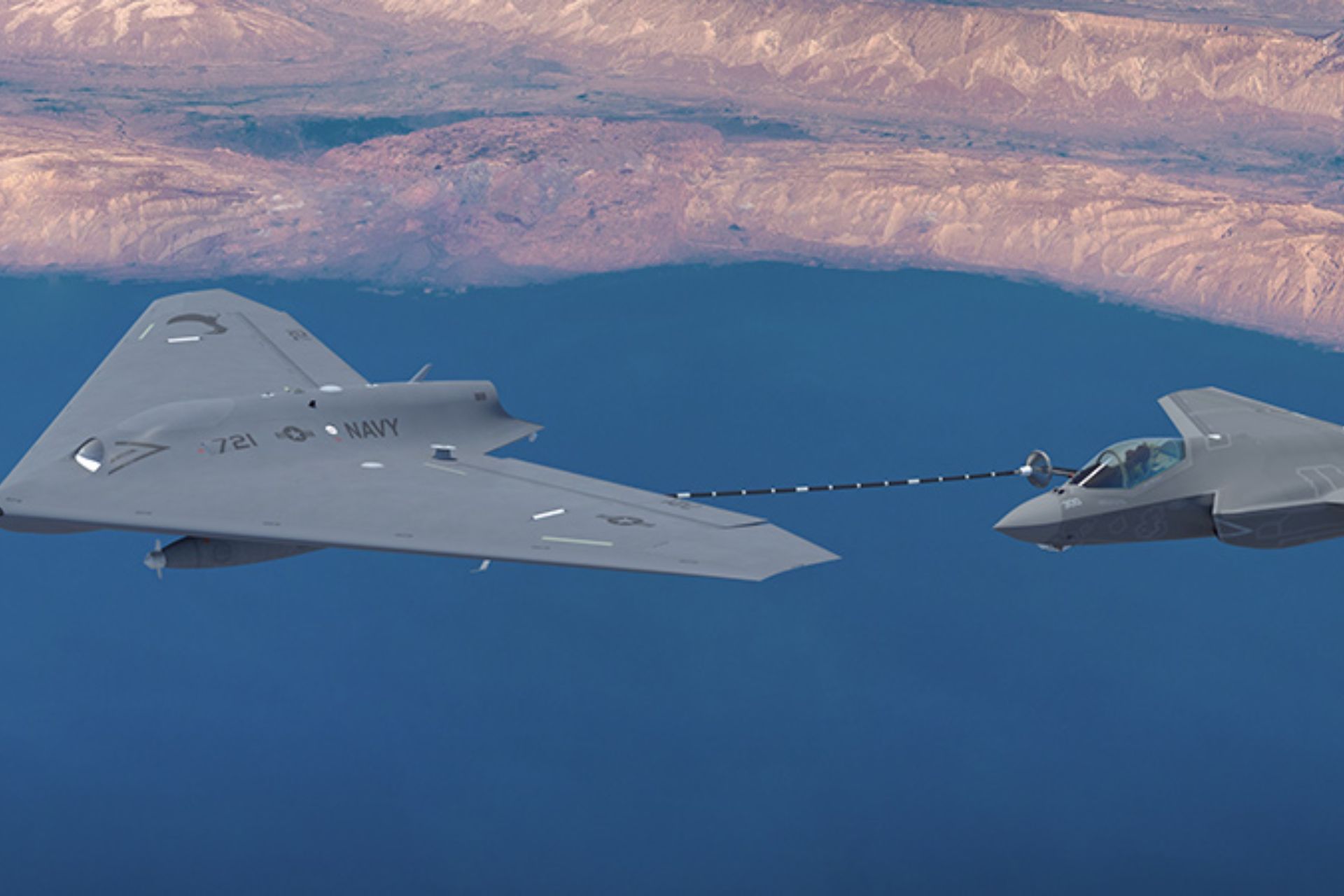 MQ25-A stealth refueling drone based on Lockheed Martin's design, here refueling an F-35C ( Picture source: Lockheed Martin)