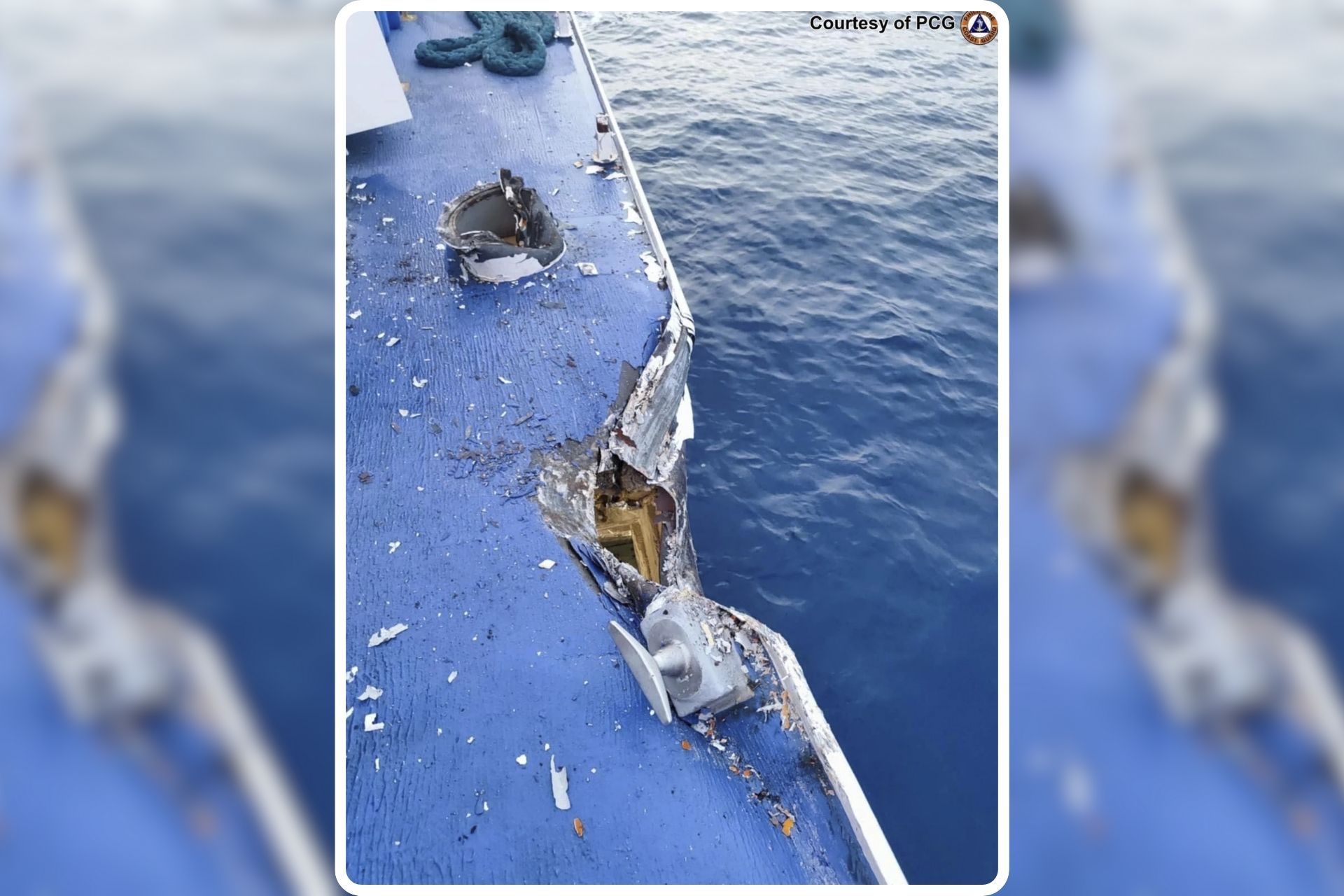 This photo provided by the Philippine Coast Guard, shows damage on the Philippines coast guard vessel BRP Cape Engano (MRRV-4411) after a collision with a Chinese coast guard ship Monday, Aug. 19, 2024 in the disputed South China Sea. ( Picture source : Philippine Coast Guard via AP)