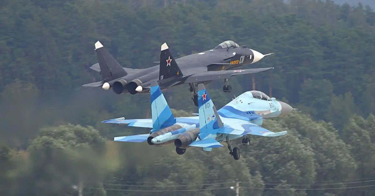 Su-47 next to a Sukhoi Su-35UB at the MAKS-2003 air show. (Picture source: Yevgeny Pashnin)