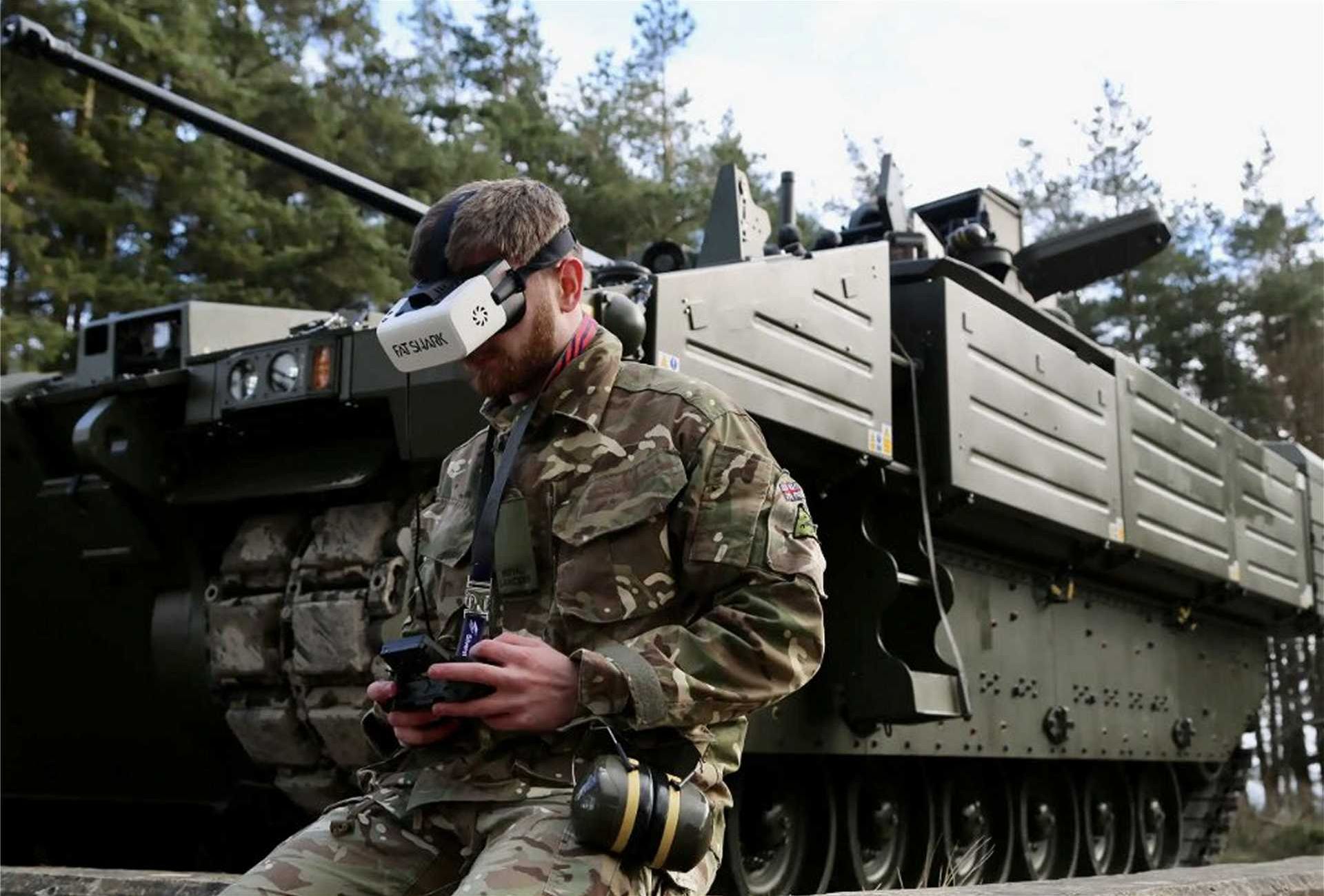 A British soldier from The Royal Lancers armored cavalry regiment operates a small uncrewed aerial system (sUAS) alongside an Ajax reconnaissance vehicle, highlighting the integration of drone technology into frontline operations. (Picture source: British army Royal armoured Corps X account )
