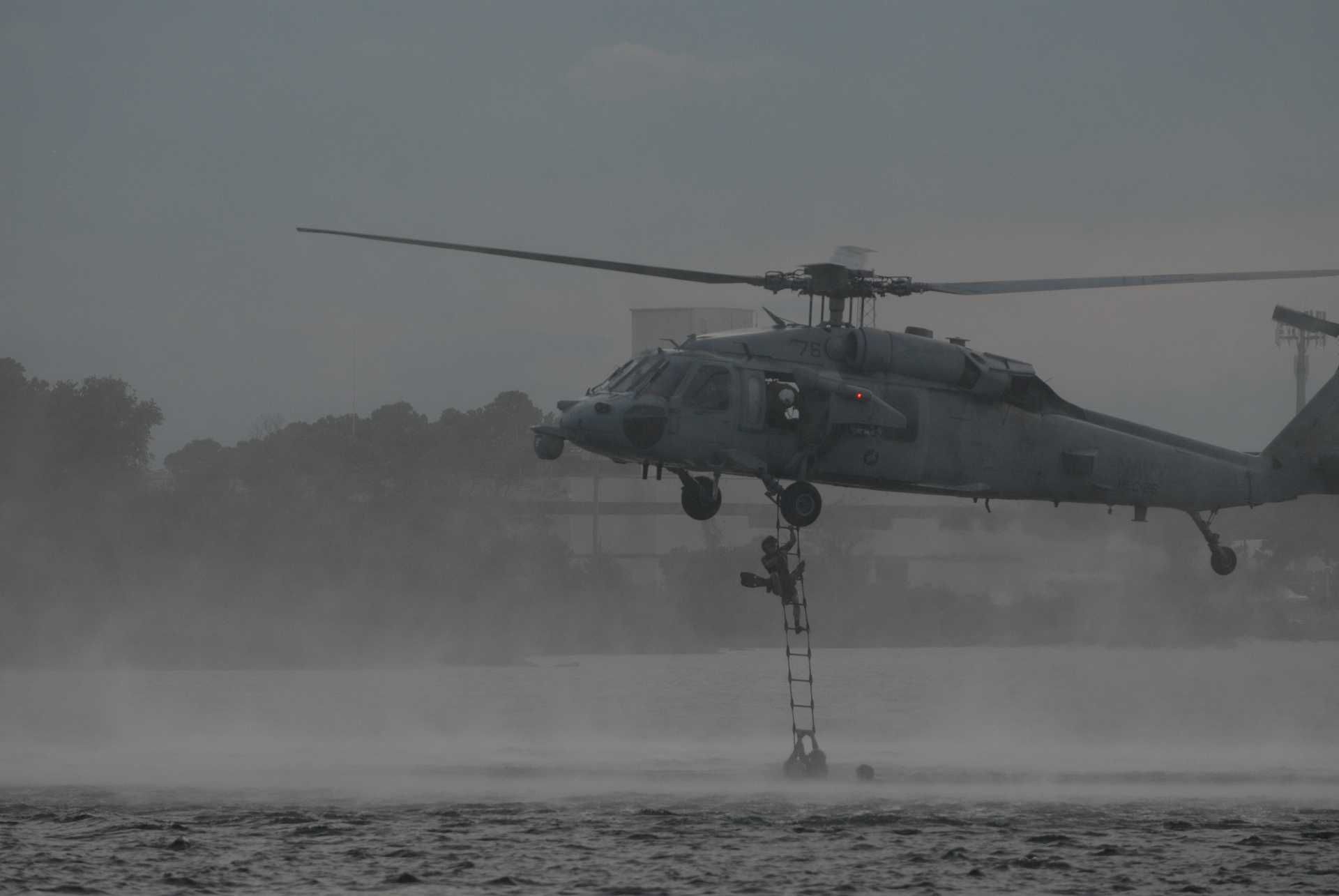 East Coast-based U.S. Navy SEALs ascend a Jacob’s Ladder during "Helocast and Recovery" training at Joint Expeditionary Base Little Creek-Fort Story, Virginia. (Picture source: U.S. DoD)