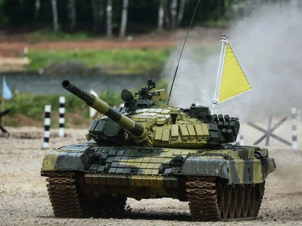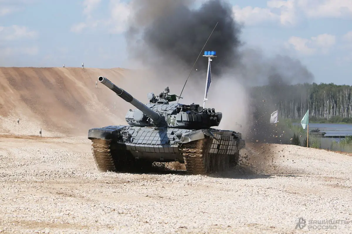 ![]() Russian army T-72B3 main battle tank at Tank Biathlon 2014 competition in Alabino range. |
