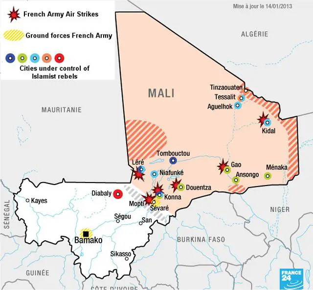 A column of about 30 French army tanks and several troop carriers, accompanied by a helicopter, crossed into Mali from Ivory Coast in an international mission to take control of the African nation’s north from Islamist extremists, French media reported Monday night, January 14, 2013.