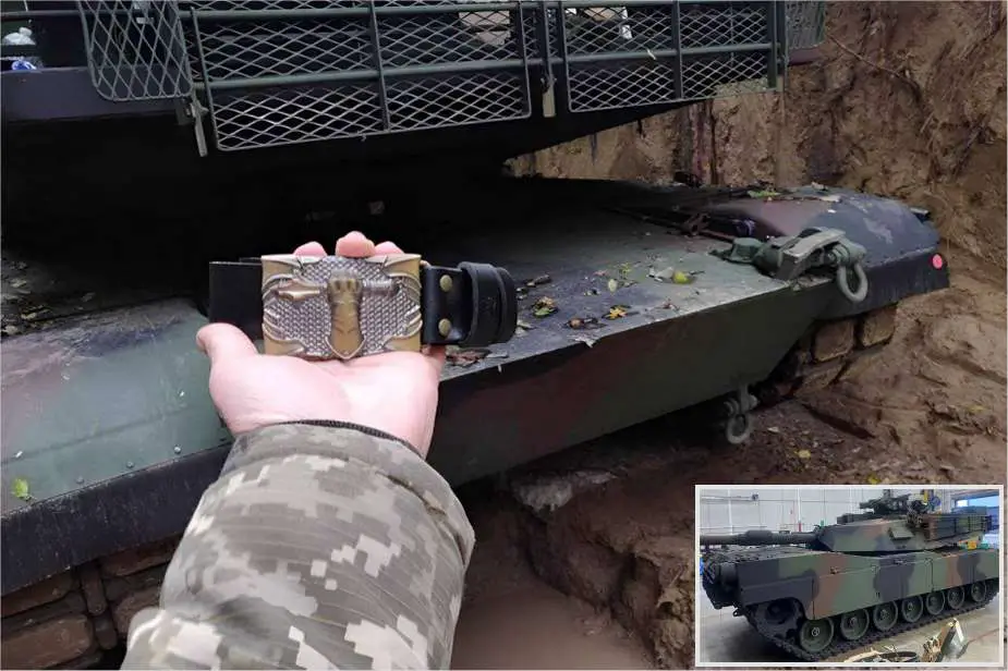 M1A1 Abrams in brand new U.S. Woodland camouflage with a Ukrainian soldier brandishing a belt buckle adorned with a "steel fist" chevron, a symbol associated with the Ukrainian tank forces (Picture source: Twitter)