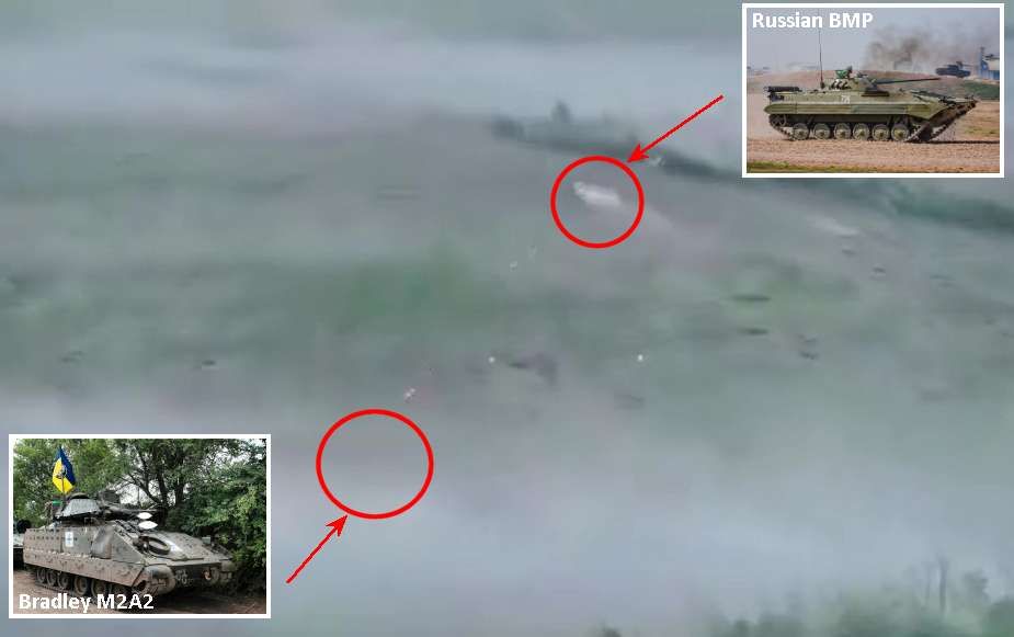 Ukrainian soldiers use U.S.-donated Bradley M2A2 tracked armored IFv Infantry Fighting Vehicle to engage Russian BMP on the move. (Picture source: X account Dimitri Video footage)
