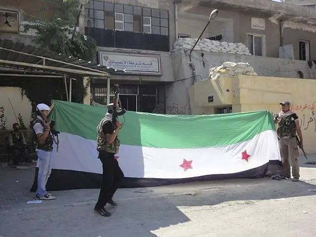 ![]() Free Syrian Army fighters pose with an opposition flag outside a police station at Al-Ansari in Aleppo August 3, 2012. |