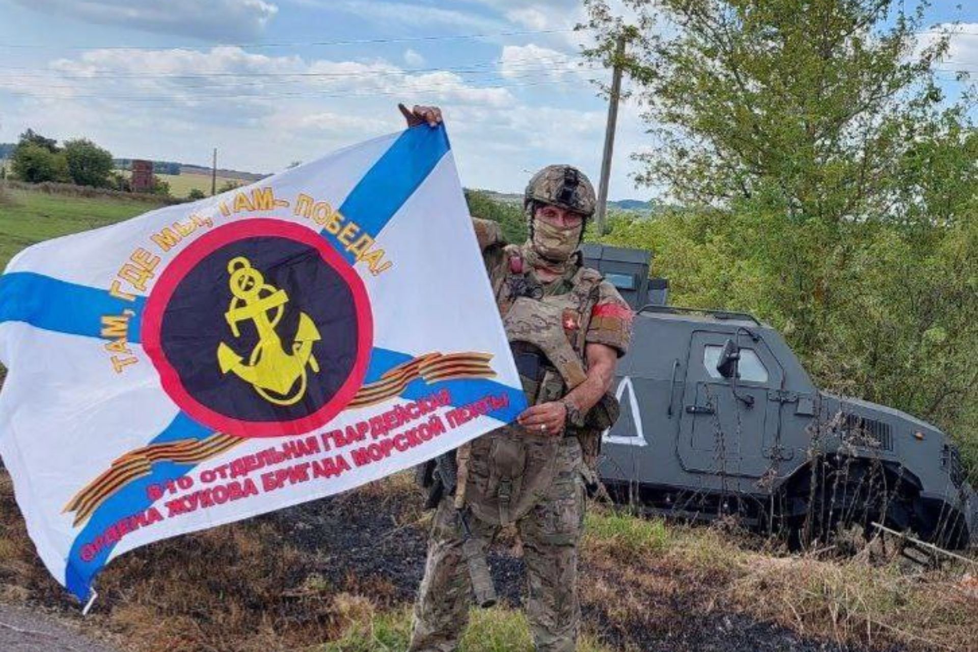 Serviceman of the 810th Separate Guards Naval Infantry Brigade of the Black Sea Fleet of the Russian Federation, Kursk oblast, front of Ukrainian abandonned vehicle ( Picture source: Russian fighters )