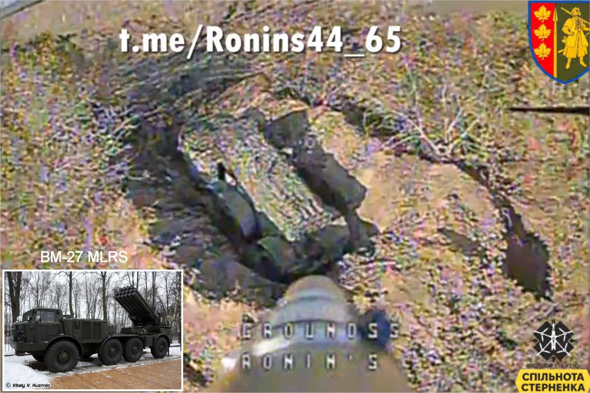 The Russian BM-27 is hit by a Ukrainian FPV drone 2 equipped with mortar ammunition. (Picture source: Ukrainian MoD)