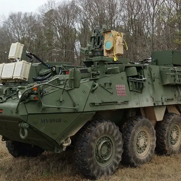 U.S. soldiers ready to use laser weapon MEHEL mounted on Stryker armored