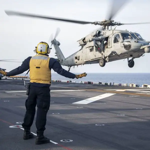 Flight operations for US Navy USS America LHA 6 amphibious assault ship with MH-60S helicopter