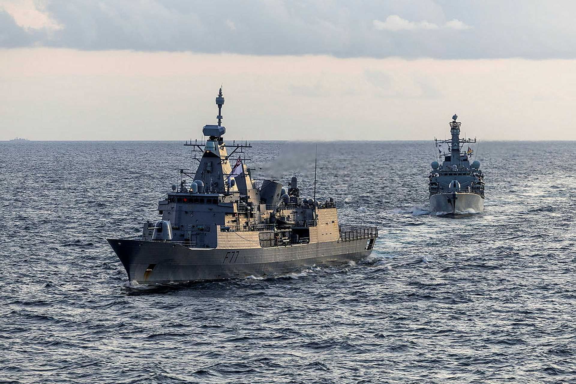 British Royal Navy HMS Richmond and HMNZS Te Kaha from New Zealand Navy maneuver alongside during Barrier Operations training with HMS Prince of Wales as part of Operation Highmast 2025. (Picture source: UK MoD)