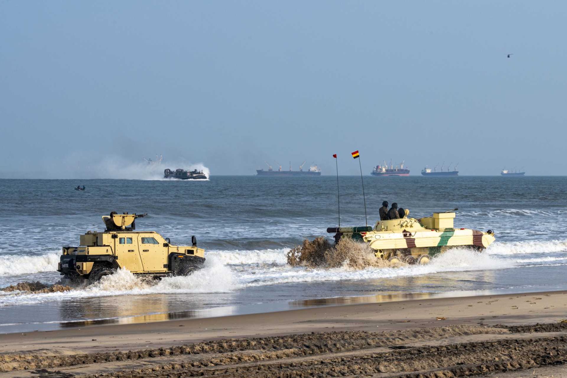 Central to the exercise was a large-scale amphibious landing operation at Kakinada Beach, led by the Indian Army’s 4/8 Gurkha Rifles Infantry Battalion, part of the 91st Infantry Brigade. Indian troops deployed ashore in Mahindra Armored Light Specialist Vehicles (ALSVs) and BMP-II Sarath amphibious infantry combat vehicles, demonstrating the mobility and combat effectiveness required in HADR and coastal operations. Their actions were closely synchronized with assets from the Indian Navy, including the INS Jalashwa (L41)—a landing platform dock that served as the primary amphibious command ship. The INS Mumbai (D62), INS Gharial (L23), INS Shakti (A57), and P-8I maritime patrol aircraft rounded out India’s naval participation, highlighting a robust maritime capability tailored to both combat support and humanitarian missions.