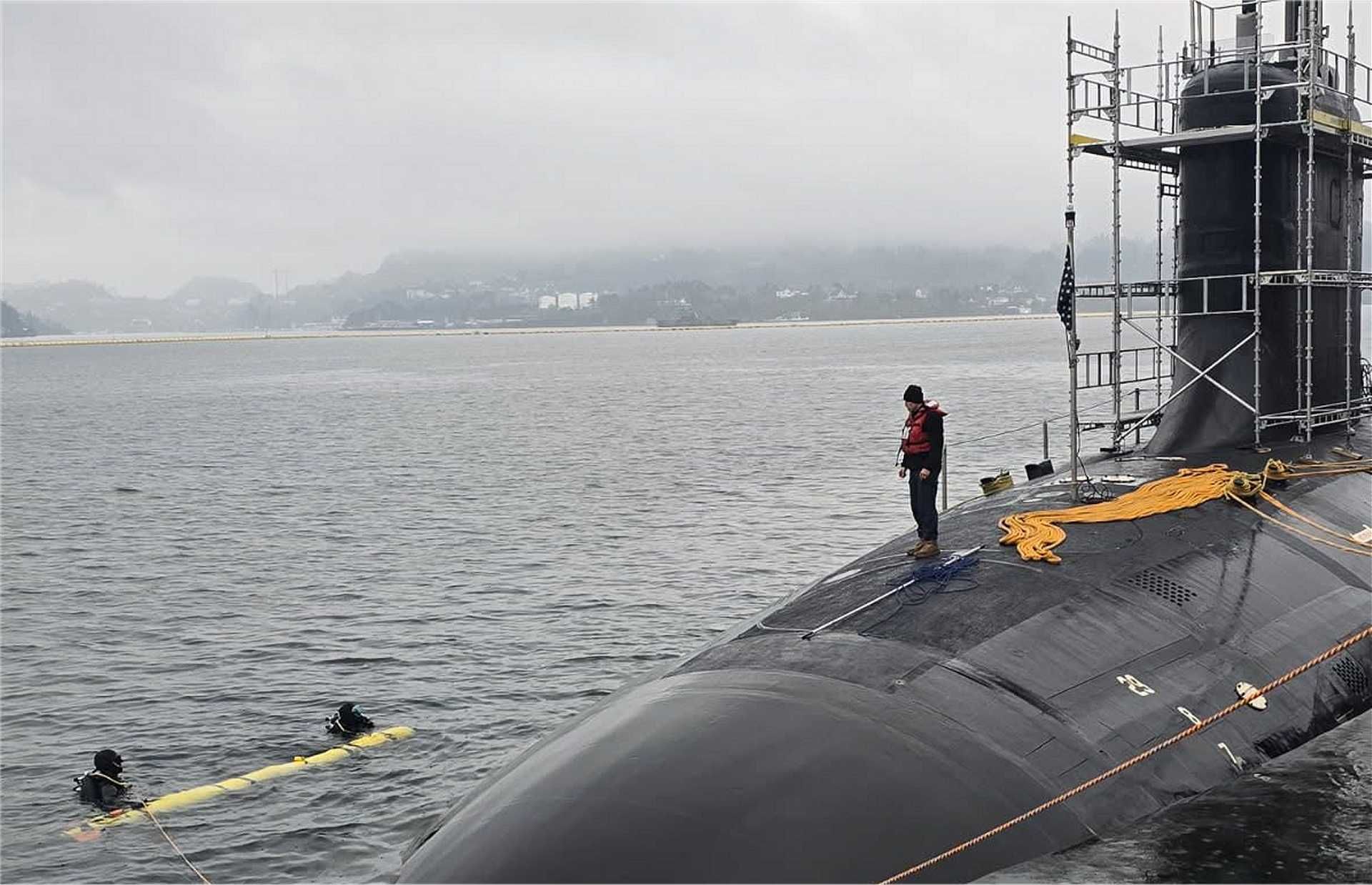 US Navy divers prepare the Yellow Moray Unmanned Underwater Vehicle alongside the Virginia-class submarine USS Delaware during a historic forward-deployed launch and recovery operation. (Picture source: Facebook U.S. Commander of Submarine Forces)