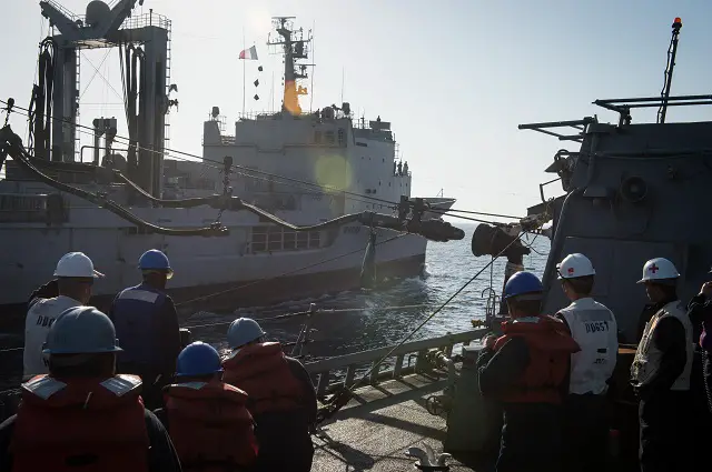 ![]() The guided-missile destroyer USS Bulkeley (DDG 84), front, sails alongside the French aircraft carrier Charles de Gaulle (R 91). (French navy photo by Chief Petty Officer Francois Marcel/Released) |