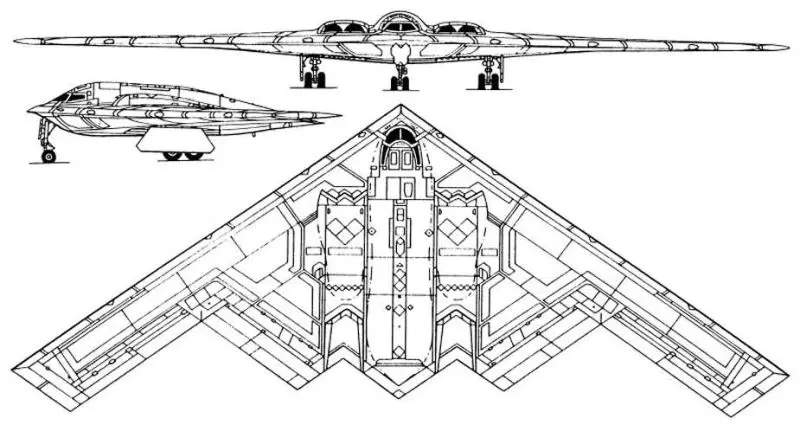 The B-2 Spirit employs a pure flying wing design, a configuration that significantly reduces radar visibility by eliminating vertical surfaces and other protrusions common to traditional aircraft layouts. This planform minimizes both radar and infrared signatures, essential for its role in penetrating sophisticated enemy air defenses. Constructed largely from carbon-fiber reinforced composite materials and layered radar-absorbent coatings, the airframe contributes to a radar cross-section (RCS) reportedly smaller than that of a small bird. The wingspan measures 52.4 meters, and the aircraft's overall length is 21 meters. The B-2 lacks a tail or fuselage extensions, with all systems, fuel tanks, bomb bays, and avionics housed within the wing itself. The crew compartment is located centrally and contains two side-by-side ejection seats for the pilot and mission commander, both of whom operate from a cockpit optimized for long-duration strategic missions. The airframe’s high aspect-ratio and internal volume also permit extended range and substantial payload capacity, while the aerodynamic shape provides excellent stability for high-subsonic cruise..