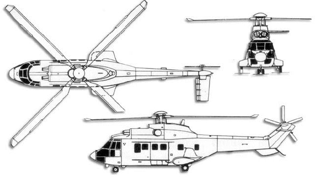 The Eurocopter AS332 Super Puma is a four-bladed, twin-engine, medium-size utility helicopter marketed for both civil and military use. This helicopter was originally designed and manufactured by the French Company Aérospatiale. The Aerospatiale SA 332 Super Puma is a development of the S A 330 Puma with more powerful Turbomeca Makila turboshafts, multipurpose air intakes, lightweight Starflex rotor head with uprated transmission and thermically de-iced main rotor blades, and wider-track landing gear with single wheels. Most of these features have already been test-flown on modified SA 330 Pumas, and a fully representative SA 332 Super Puma prototype first flew on 13 September 1978. Production of this new version was commenced in August 1978, with the first completed SA 332C civil example delivered (to Petroleum Helicopters) in 1981. In its initial commercial form, the SA 332 Super Puma has the same capacity as the SA 330 (two crew plus 19 passengers) but markedly superior performance. Yet greater capability is offered by the 'stretched' version, the SA 332L Super Puma, the prototype of which first flew on 10 October 1980. Compared with the basic SA 332 Super Puma, the SA 332L has its fuselage lengthened by 0.76 m in, and an extra window has been added on each side of the forward fuselage. The 'stretch' increases passenger capacity to 24, and the increased payload with the same fuel capacity initially meant reduced payload/range performance. However, Aerospatiale has now developed swept-back tips for the rotor-blade tips, and this permits an initial increase in maximum take-off weight of 200 kg, with another increase of 200 kg to be certificated later. The effect of this weight increase is to boost the range performance of the SA 332L to a figure closely comparable to that of the SA 332. |