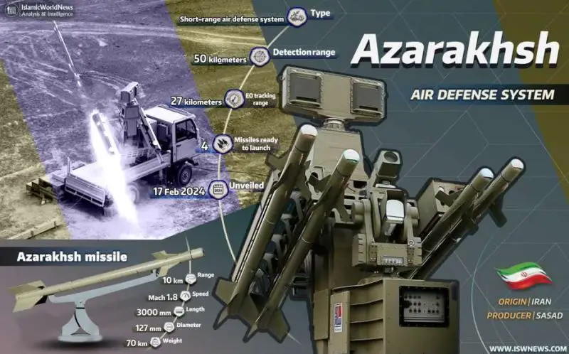 Unveiled on February 17, 2024, the Iranian-made Azarakhsh air defense missile system exemplifies the capabilities of a Transporter Erector Launcher and Radar (TELAR) system. It combines high agility with advanced detection and engagement capabilities, making it a formidable asset in Iran's defense strategy against low-altitude threats. The system is engineered for rapid deployment and offers comprehensive 360-degree coverage by integrating radar and electro-optical tracking systems. This allows the Azarakhsh to be highly effective in various combat scenarios.