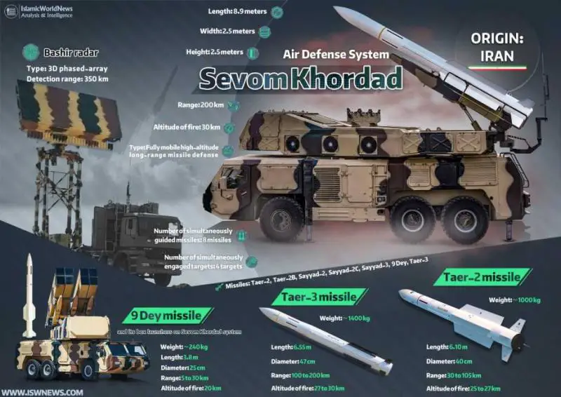 The Taer-3, also designated as the long-range missile of the Khordad-3 system, represents the most advanced interceptor integrated into the platform. It provides a reported maximum engagement range of 200 kilometers and a flight ceiling of 30 kilometers, elevating the system into the long-range high-altitude air defense category.