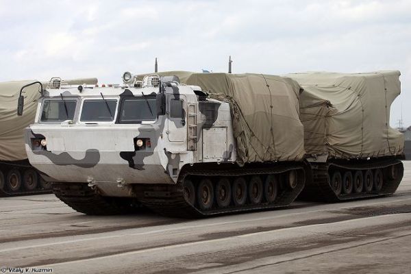 The Pantsir-SA is based on the chassis of the DT-30PM-T1 tracked articulated tractor (DT stands for ‘articulated tractor’ in Russian), an all-terrain vehicle which consists of two tracked vehicle units linked by a steering mechanism. The DT-30PM is specially designed to be used in the harsh climatic conditions of the Arctic region. The first vehicle of the DT-30PM is a tracked platform with water-displacing sealed all-welded body housing a crew cabin for 4 - 7 people equipped with autonomous heating and air ventilation systems, power plant, transmission and a cargo compartment located at the rear of the crew cab. The Pantsir-S1 weapon station is mounted on the tracked chassis of the second vehicle. The DT-30PM has a curb weight of 31,500 kg, a payload of 30,000 kg and a length of 16.08 m, a width of 3.10 m and a height of 3.33 m.
