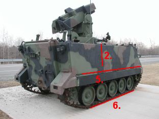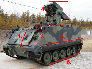 est de forme rectangulaire avec l'avant légèrement incliné. C'est le châssis de base du M113. Les flancs du véhicule sont lisses. Une groupe de deux phares est installé sur la partie superieure à l'avant gauche et droit de la coque. Une grande plaque pare vague de forme rectangulaire est installée à l'avant de la coque. L'arrière de la coque dispose d'une grande porte hydraulique. Découpé dans cette porte, on trouve une petite porte d'accès manuel plus petite.