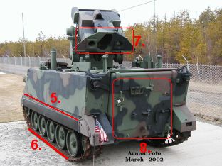 5. Jupe en caoutchouc qui couvre la partie supérieure du train de roulement. 6. Cinq roues de route sans galets supports. 7. L'avant du bloc missile dispose de deux trous circulaires et un autre ovale au centre. 8. Porte hydraulique sur l'arrière de la coque.