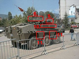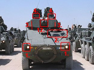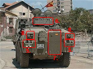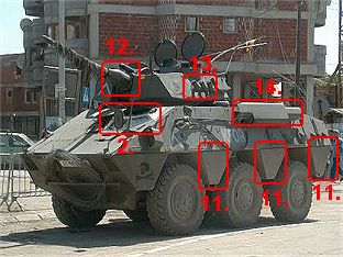 8. Groupe de deux petits phares à l'arrière gache et droit de la coque. 9. Trois lance-grenades fumigènes sur chaque flanc de la tourelle. 10. Deux grosses boîtes de forme rectangulaire sur le flanc droit de la coque. 11. Trois blocs de forme rectangulaire entre chaque pneu. 12. Base du canon de forme cylindrique. 13. Trois lance-grenades fumigènes sur chaque flanc de la tourelle. 14. Bloc d'échappement sur le flanc gauche.