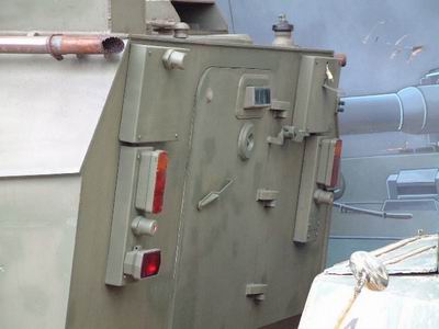 5. Tube et système d'échappement à l'arrière gauche et droit des flancs de la coque. 6. Pneus avant, situé à l'avant de l'extrémité de la coque. 7. Petite porte de forme rectangulaire sur chaque flanc de la coque. 8. Petit épiscope au-dessus des portes latérales. 9. Pneus arrières, encastré dans la coque, l'emplacement est de forme rectangulaire.