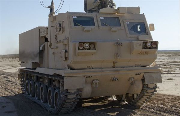 The M270A1 is based on a rebuild M993 Carrier tracked chassis (a derivative of the Bradley Fighting Vehicle). The layout of the M270A1 is similar to the M270 with the Launcher Loader Module mounted at the rear of the vehicle and a fully enclosed cab at the front of the tracked chassis. The upgrades of the M270A1 include cab and hull modifications to improve occupant survivability, and suspension modifications to accommodate the vehicle’s increased weight. The three-man crew consists of the driver, gunner, and commander seated in the fully enclosed cabin. All firing operations are carried out from inside the cabin. The latest variant of the M270A1 uses a new Improved Armor Cab (IAC) to increase the protection of the crew and the addition of mine protective seats. The U.S. Army wanted to provide greater crew protection across all fielded MLRS launchers comparable to that provided by the HIMARS. The M270A1 IAC is designed to protect the crew against various direct fire, mine blast, and underbody fragmenting improvised explosive device threats.