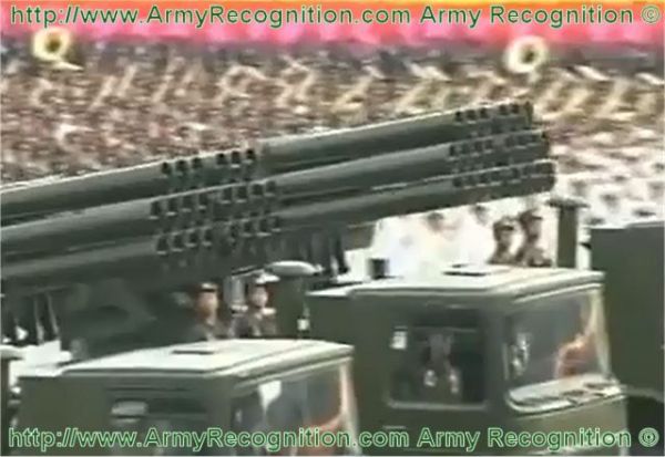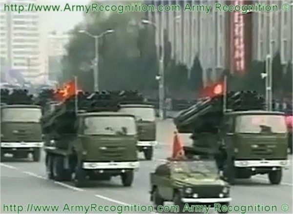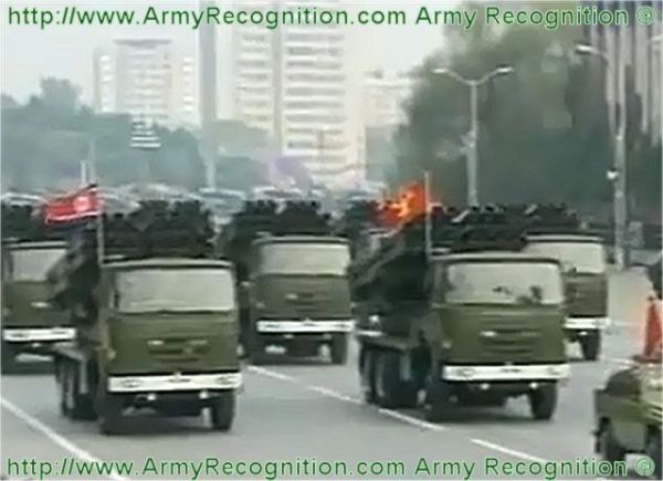 M1991 MRLS has 22 launching tubes and fires the same 240-mm rockets as the M-1985 MRLS. The rockets launcher system is mounted at the rear of the truck chassis just behind the crew cab. The M-1991 rocket pack is easily identified as it has 2 rows of 8 tubes and 1 row of 6 tubes. It has various warhead capabilities, including HE-FRAG, smoke, incendiary and chemical. A standard HE-FRAG warhead weights 90 kg and contains 45 kg of explosives. Before firing, four stabilizers are lowered to the ground; these are positioned one either side at the rear, and one at the left and right of the vehicle A claimed maximum range of fire is 43 km. The maximum range is 30 km, and now 60 km for the new version Juche 100.