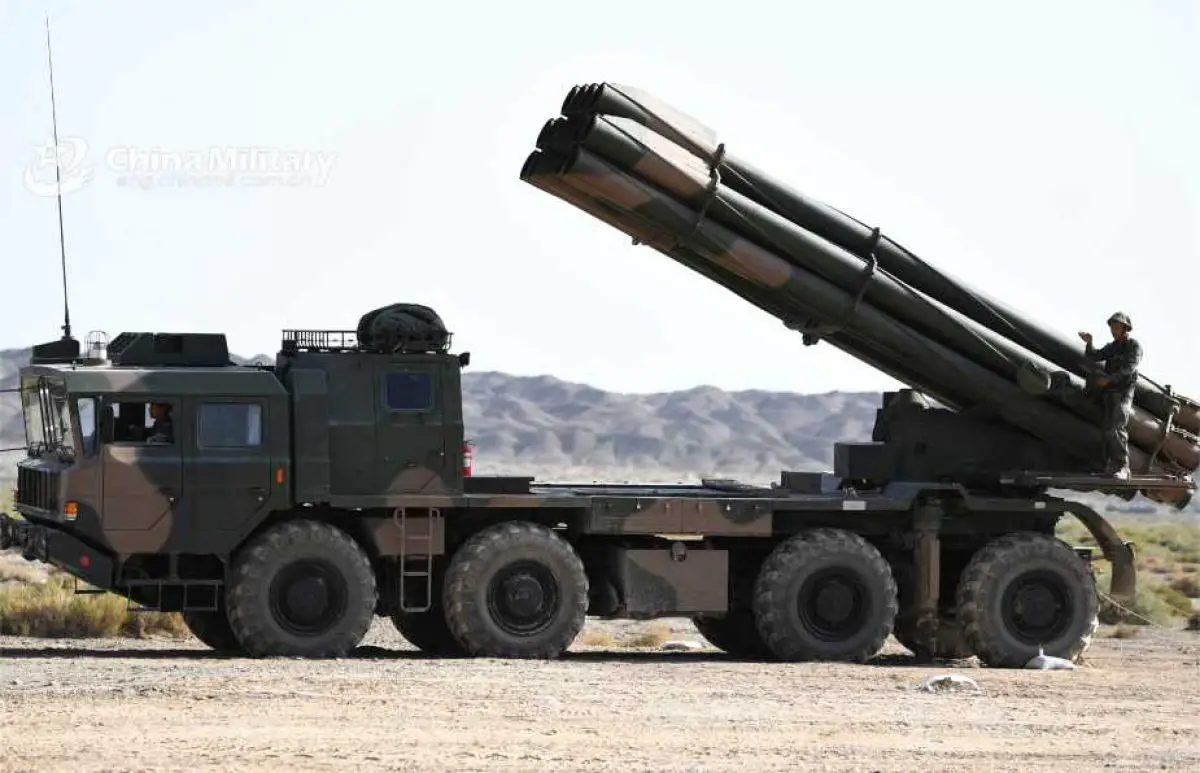 The PHL-03 is based on the Wanshan WS2400 8x8 heavy military truck chassis, which provides the mobility and payload capacity required for a heavy rocket artillery system. Powered by a diesel engine delivering approximately 500 horsepower, the PHL-03 reaches road speeds of up to 60 kilometers per hour and offers a range of approximately 650 kilometers. The chassis features an automatic transmission system and an adjustable central tire inflation system that improves cross-country mobility by adapting to terrain conditions. The suspension is designed to support the 43-ton combat load without compromising stability during movement or launch. The vehicle can ascend gradients up to 57 percent, traverse rough terrain, and ford water obstacles up to 1.1 meters deep, making it well suited for diverse operational environments.