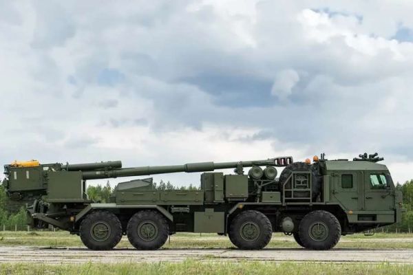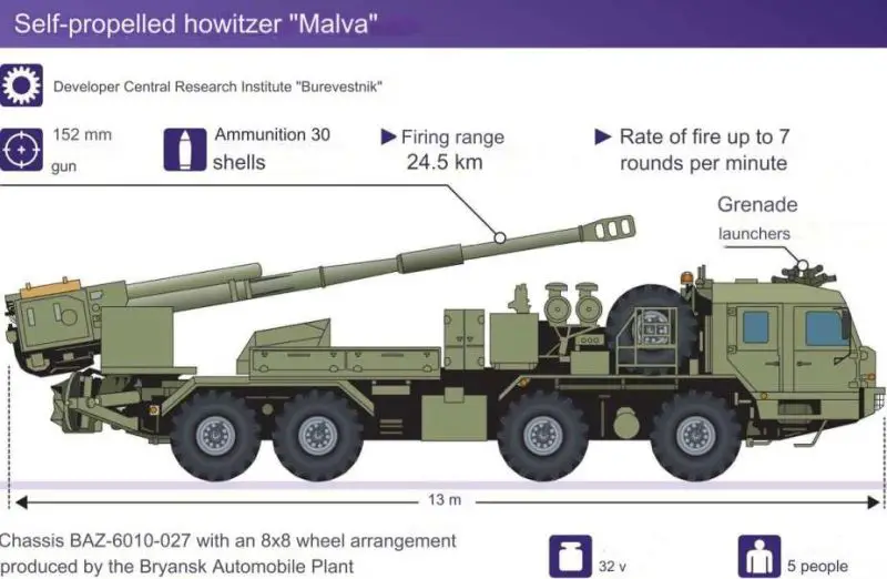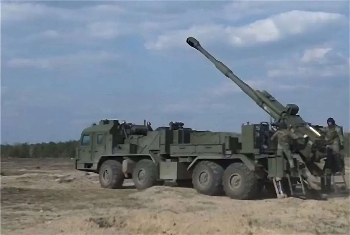 The 2S43 Malva features an open-top design with the howitzer mounted at the rear of the vehicle. Built on the BAZ-6010-027 8x8 truck chassis, the vehicle measures 13 meters in length, 2.75 meters in width, and 3.1 meters in height, with a combat weight of 32,000 kg. The crew of five, including the commander, driver, gunner, and two loaders, is housed in an armored cabin at the front. This cabin provides protection against small arms fire and artillery shell splinters.When operating in fully automatic mode, the crew inside the armored cabin utilizes the fire control system to manage targeting and firing procedures. The ballistic computer calculates firing solutions based on input from GPS navigation and automated targeting systems. Once target coordinates are received, the system can engage the target within 30 seconds. The crew monitors and adjusts parameters through advanced optics, including thermal imaging and night vision, ensuring accuracy in diverse environmental conditions.