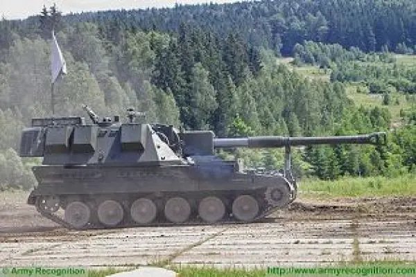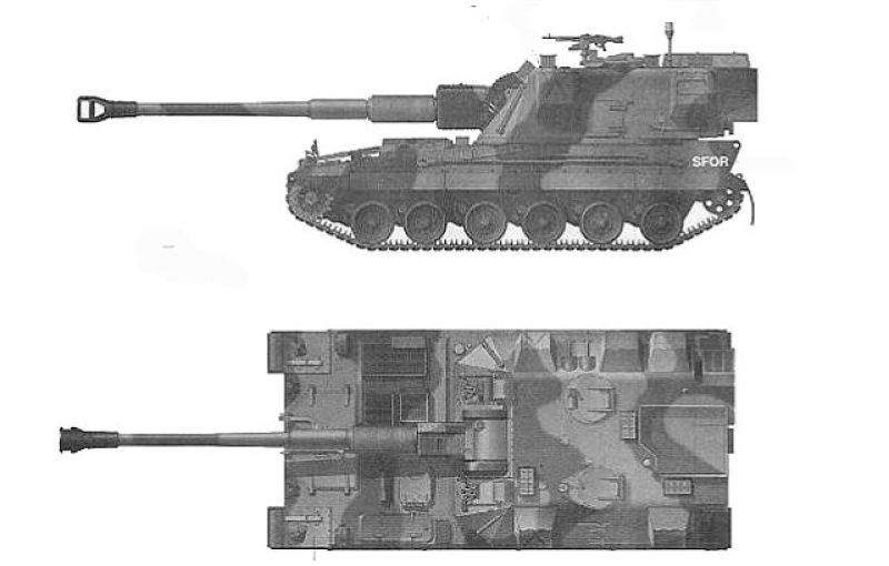 The AS90 Braveheart 155mm self-propelled howitzer is motorized with a Cummins VTA-903T-660 V-8 diesel engine developing 660 bhp at 2,800 rpm coupled to a Renk LSG 2000 fully automatic transmission with 4 forward and 2 reverse gears. The AS90 can run at a maximum road speed of 55 km/h with a maximum cruising range of 370 km. It can negotiate a gradient up to 60% and a side slope of 25% maximum. The vehicle can climb a vertical obstacle of 0.88 m and a trench of 2.8 m. It can ford a depth of 1.5 m without preparation. The hydro-pneumatic suspension of the AS90 consists on each side of 6 road wheels, four track-return rollers with the drive sprocket at the front, and an idler at the rear. The upper part of the suspension is protected by rubber plates.