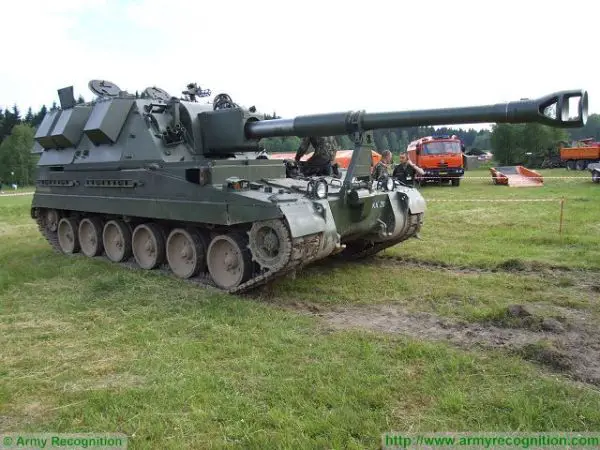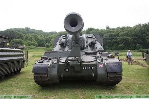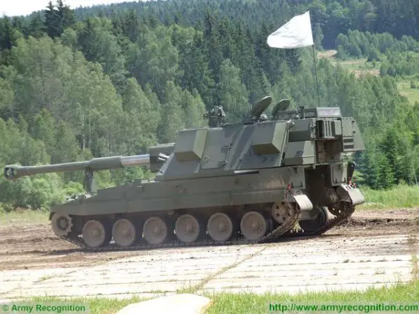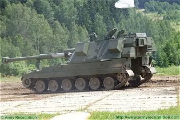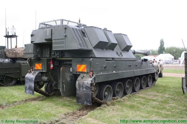 The AS90 Braveheart 155mm self-propelled howitzer is fitted with a large turret mounted at the rear of the hull of a tracked chassis. The gun is equipped with recoil and hydrogas suspension system. It has a double-baffle muzzle brake, a fume extractor, and a split-block breech. Turret traverse is through a full continuous 360º and weapon elevation is from -5 to +70º. Elevation and traverse drives are both electric and operate at a rate of 10º/s. Full manual controls are provided in case of electric failure. The AS90 is armed with a 155 mm 39 caliber barrel that can fire all the standard NATO artillery projectiles including the HE M107 and extended range types. Thanks to an automated loading system, it can fire a burst of three rounds in less than 10 seconds, an intense rate of 6 rds/min for 3 minutes, and a sustained rate of fire of 2 rds/min. The AS90 can carry a total of 48 projectiles with 31 stowed in the turret bustle in four magazine modules, each of which has a motor that moves the required projectile to the correct position. The remaining 17 projectiles are stored in the hull of the vehicle. With standard ammunition, the AS90 can fire at a maximum range of 24,700 m and 30,000 m with assisted projectiles. The barrel is locked in the road position by a clamp mounted at the front of the hull. In the firing position, the barrel clamp is operated by the driver from inside the vehicle.