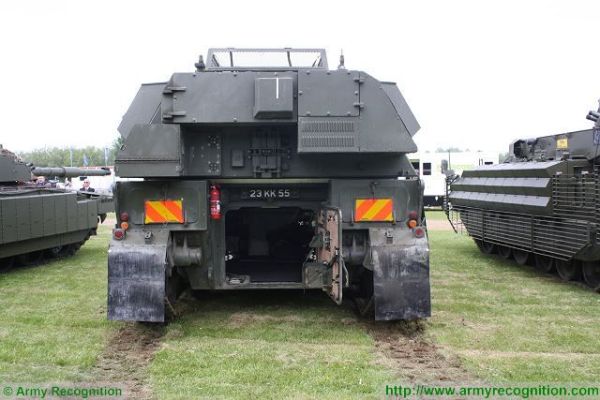 The AS90 Braveheart 155mm self-propelled howitzer is divided into 3 compartments with the driver sitting at the front left with the power pack to his right and the turret located at the rear of the hull. The AS90 has a crew of 5 including the driver, commander, gunner, loader, and co-loader. The hull and the turret of the AS90 Braveheart 155mm self-propelled howitzer are of all-welded steel armor construction with a maximum thickness of 17 mm which provides protection for the crew against the firing of small arms and shell splinters. There is a large door opening to the rear of the chassis for access and ammunition resupply and mounted on either side of this on the outside are two integral armored containers that can be used to store supplies and other equipment. Externally mounted on the turret shell are five stowage boxes, three to the right side and two to the left side, one for each crew member's use. There is a small hatch to the left side of the turret.