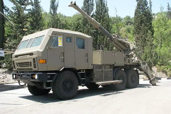 The ATMOS is a wheeled self-propelled howitzer truck, with on the rear part a Soltam Systems 155mm/52 ca...