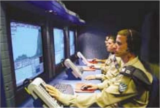 The "Citron Tree" inside the Golden Citron has three banks of operator consoles laid out in a U shape. In the center sits the officer in command who oversees the engagement, but also has links to the other parts of the battery as well as to IAF headquarters. On the commander's right sits the engagement officer, who ensures that targets are assigned to other engagement officers sitting on the right-hand leg of the U. Each is assigned a geographical area to defend and two of the officers are more senior as they have an overview of Patriot batteries. To the left of the commander is the resource officer, who monitors the status and readiness of the missiles. On the left of the U sits the sky picture officer, who is in contact with the Home Front Command and uses the center's ability to predict impact point to alert the civil authorities. Also at these consoles are an intelligence officer and an after-action/debrief officer, who uses recordings as it is impossible to absorb all the information during engagements. All in all, the "Golden Citron" is manned by 7–10 operators. -