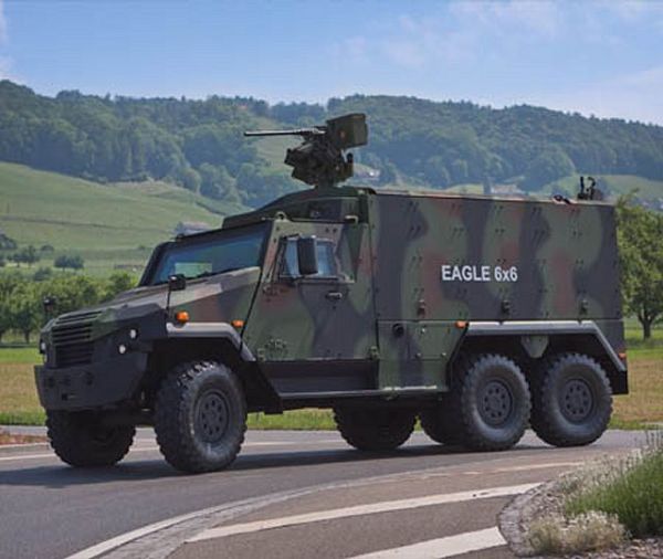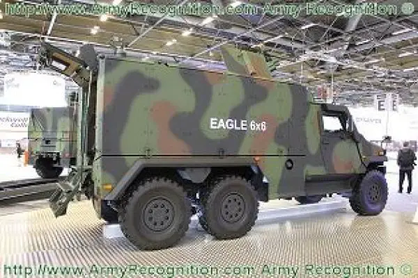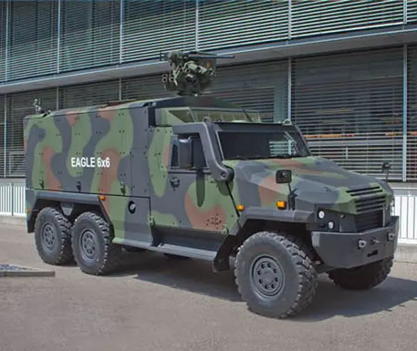 The EAGLE is a family of 4x4 and 6x6 light tactical armored vehicles developed and designed by the Swiss company Mowag which is now part of General Dynamics European Land Systems (GDELS). The production of the first variant of the vehicle started in 2003. The EAGLE 4x4 and 6x6 family uses the same chassis and drive train components, offering unmatched payload/gross vehicle weight ratio and a flexible internal layout to support various mission roles. The EAGLEcan be configured to fulfill a wide range of roles such as APC (Armored Personnel Carrier), ambulance, recovery, command, reconnaissance, logistics and military police vehicle providing seating capacity for up to 14 soldiers and reserved capacity for a comprehensive communication and mission system fit. The EAGLE V is the latest variant in the EAGLE family that was unveiled in 2010 during Eurosatory, International Defense exhibition that was held in Paris, France. This next-generation EAGLE retains the key features of the existing in-service EAGLE but with more internal volume, payload, protection, and mobility. The EAGLE is in service with Denmark, Germany, and Switzerland.