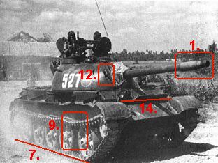 1. Évacuateur de fumée au bout du canon. 2. Toile couvrant la base du canon. 3. Emplacement du système optique de tir à gauche du canon. 4. Boîtes de rangement sur les flancs de la coque, à gauche et à droite. 5. Deux barres de maintien de forme bombée à gauche et à droite sur les flancs de la tourelle. 6. Trois griffes sur les gardes boue à l'avant de la coque. 7. Cinq roues de route sans galets supports. |