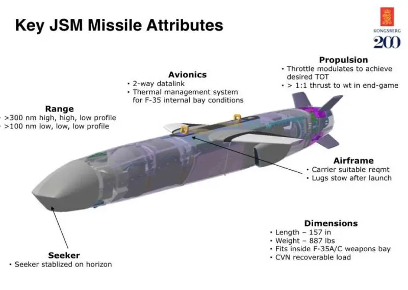 The Joint Strike Missile (JSM) is a next-generation air-launched cruise missile developed by Kongsberg Defence & Aerospace, Norway's leading defense contractor, in collaboration with Raytheon Missiles & Defense in the United States. The missile is based on the proven technology of the Naval Strike Missile (NSM) and has been adapted specifically for internal carriage within the weapons bays of fifth-generation fighters such as the F-35 Lightning II.