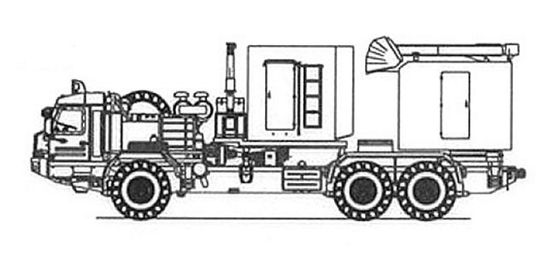 The 50N6A MFMTR Multi-Function Mobile Tracking Radar uses a 6x6 truck chassis BAZ-69092-12. This a three axle chassis with a wheel arrangement of 6x6, a three-seat cab and a behind-the-cab engine. The engine is the YaMZ-8424.10-033 multi-fuel four-stroke eight cylinder V-type liquid cooled diesel with a power of 450 hp. This truck can run at a maximum speed of 80 km/h with a maximum road range of 1,000 km.