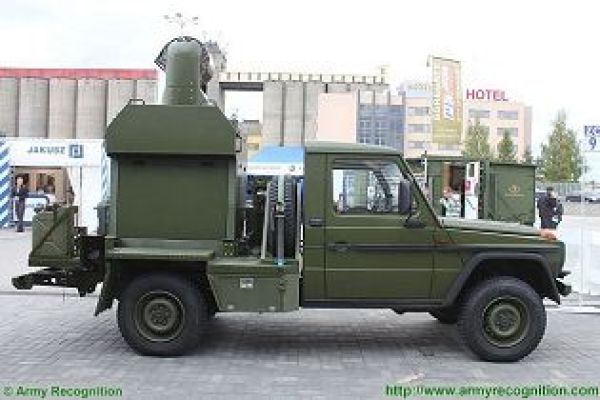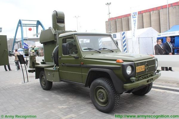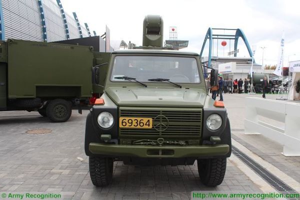 The Multi Sensor Platform MSP 500 is mounted at the rear of a G-Class Mercedes 4x4 light tactical vehicle. The Electro Optical (EO) sensor provides passive cueing data to the FDC (Fire Distribution Center) for passive engagements. The sensor is actively stabilized and is equipped with a GPS (Global Positioning System) and North Finding Unit, thus highly maneuverable, flexible and easy to deploy. The EO sensor is remotely controlled and operated from the FDC. A power generator is mounted at the rear of the vehicle. a spare wheel si available at the rear of the crew cabin. In travel position the Multi Sensor Platform MSP 500 is lowered within a small shelter mounted at the rear of the G-Class vehicle chassis.